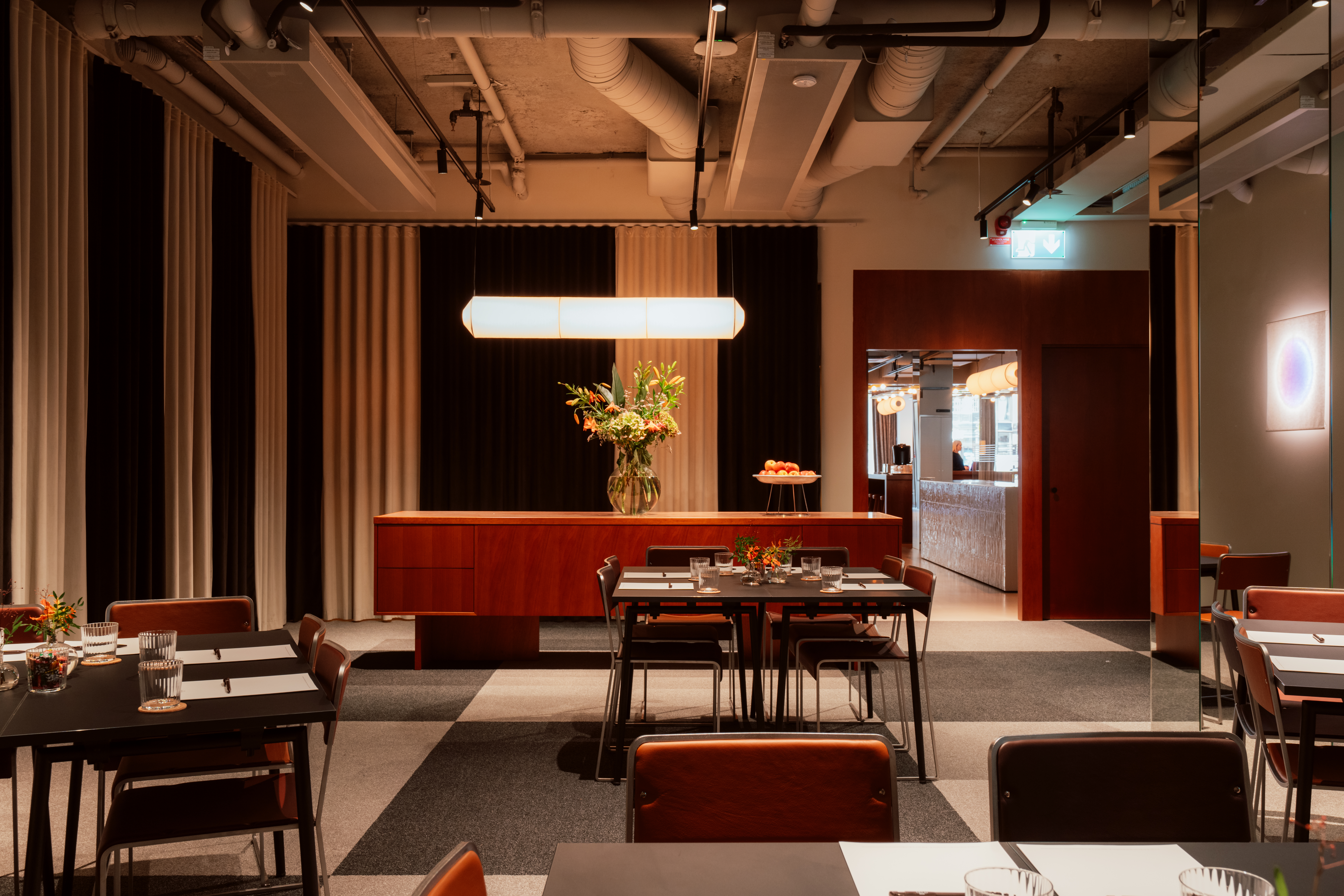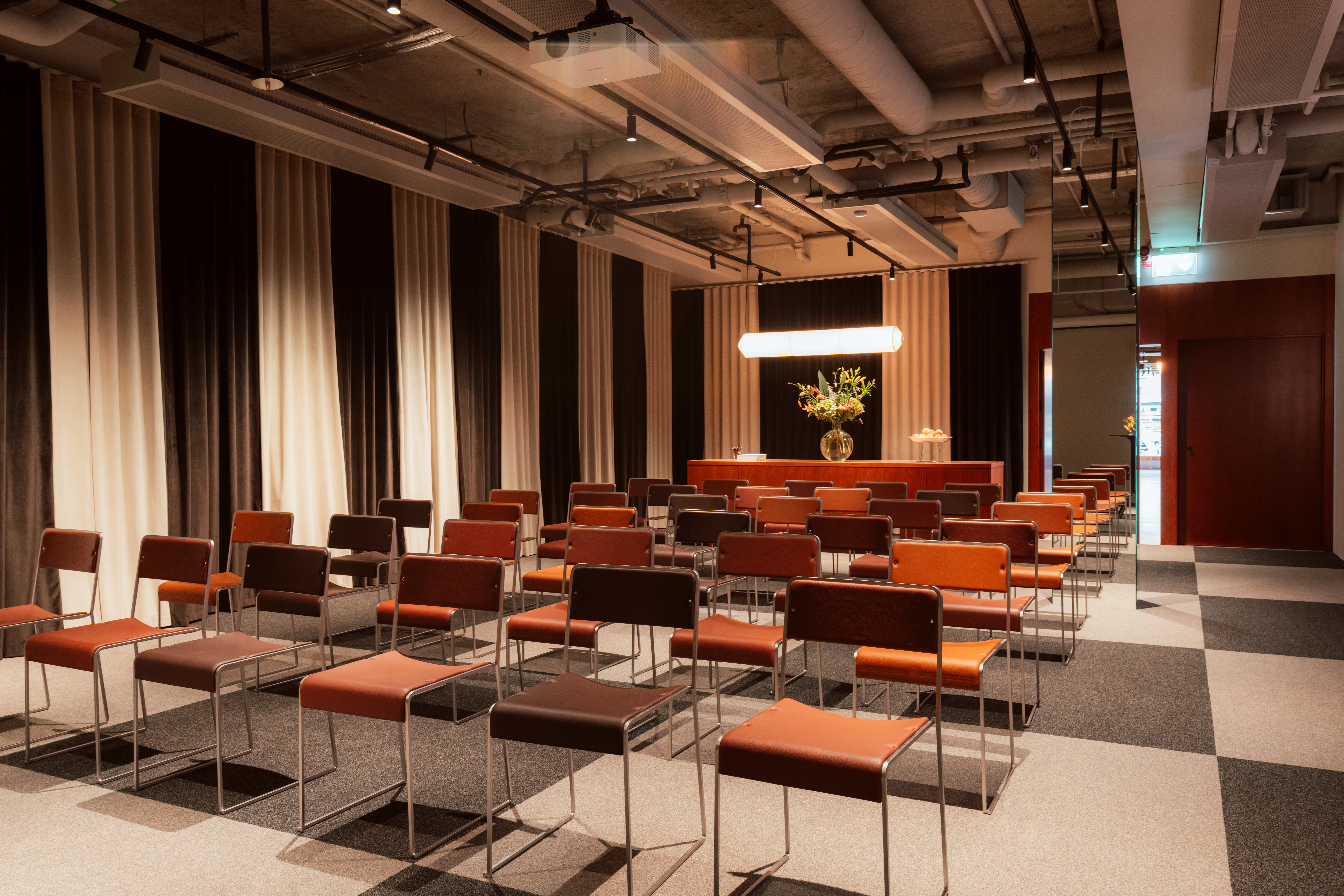 Clara umfasst ganze 104 m² und ist ein flexibler Raum mit vielfältigen Möglichkeiten. Hier ist Platz für alles, von kleineren Vorstandssitzungen bis hin zu größeren Präsentationen und Abendessen. Der Raum bietet Platz für bis zu 100 Personen in Theaterbestuhlung und ermöglicht verschiedene alternative Bestuhlungsvarianten wie Schulbestuhlung, U-förmige Tische und Gruppenbestuhlung. Für Abendessen bietet der Raum Platz für bis zu 70 Gäste, und bei einem Empfang kann Clara bis zu 100 Personen begrüßen.